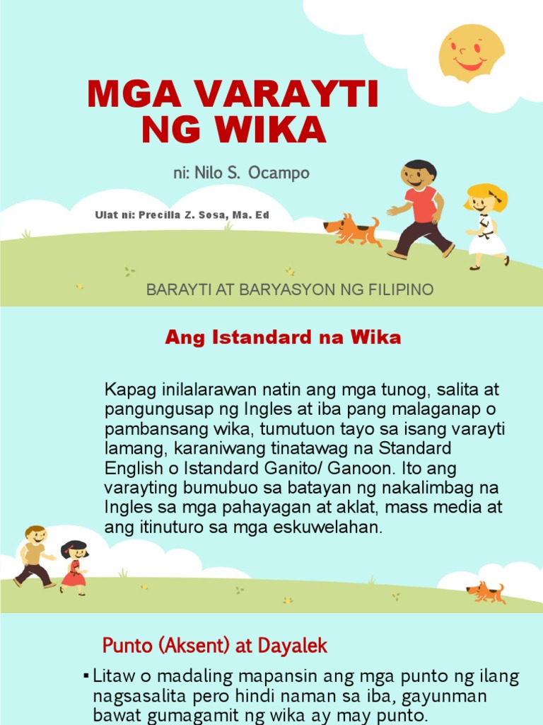 View Aralin 2 - Barayti ng Wikang Filipino Gomezdocx from CS MISC at Harvard University. Pagkatapos ng aralin ang mga mag- aaral ay inaasahang. 92-1 na naglalahad ng Batayang Deskripsyon ng Filipino.