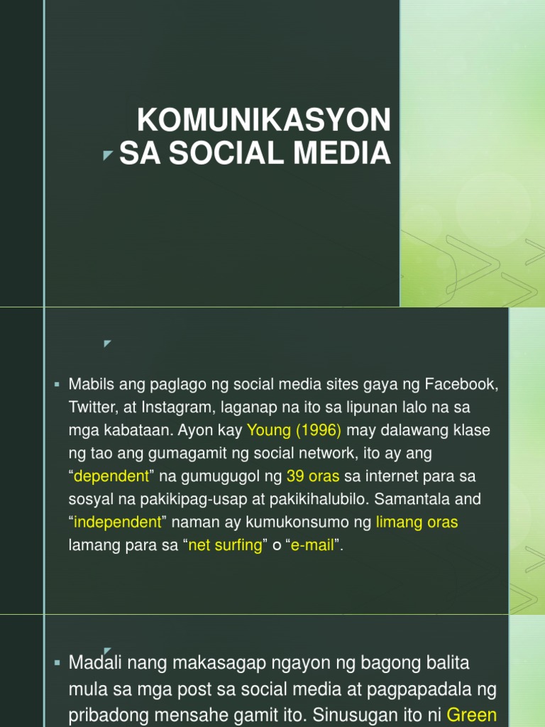 Nabibigyang kahulugan mo ang internet at social media. Bilang estudyante at isa sa mga millennials tinatawag na generation Y o mga taong ipinanganak sa pagitan ng 1980 hanggang 2000 malaki ang iniaambag ng Internet sa pagkatuto ng. Anonuevo at Nocum 2015 Nangunguna na danang pag-gamit ng mgaSocial Media Sites na patok sa makabagong panahon.