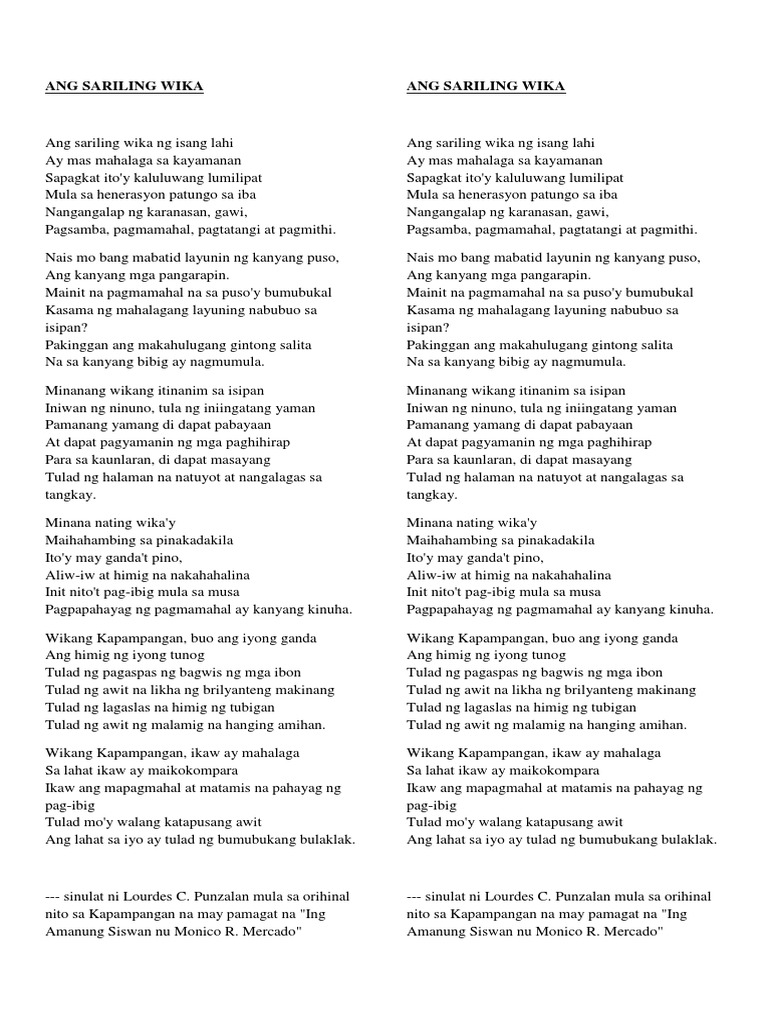 Lahat ng bansa ay may sariling wika. Halimbawa ng mga Tula Tungkol sa Wikang Filipino. Ang punyal na ito ay ang wikang Filipino.
