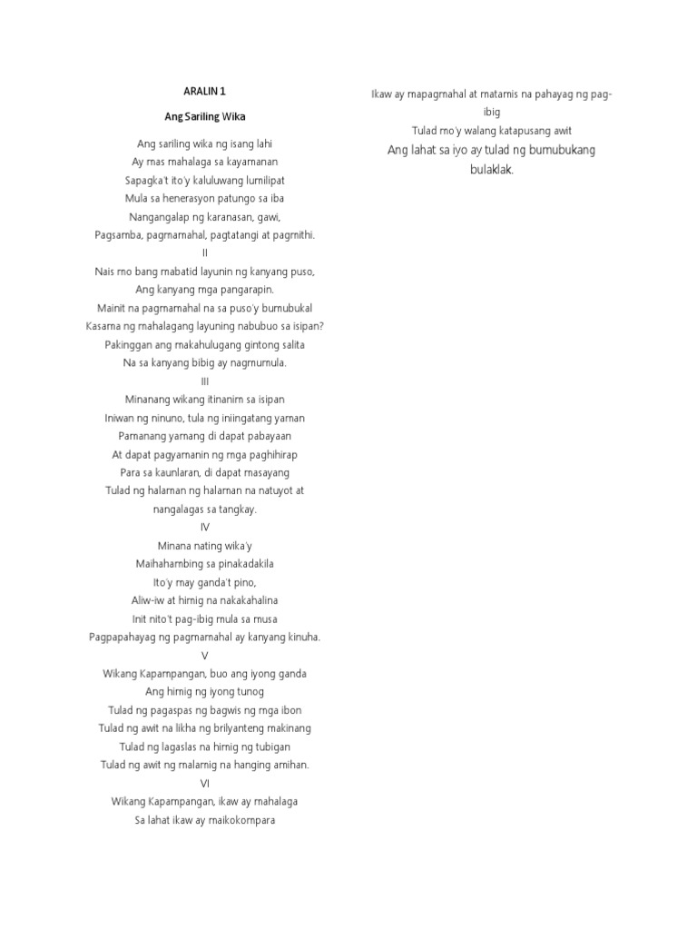 92-1 na naglalahad ng Batayang Deskripsyon ng Filipino. Makatulong nawa ang mga sumusunod na tulang ito at maging pundasyon upang mas lalo pa nating pag-alabin ang ating pagmamahal sa ating sariling wika. Sa bansang tahanang iyong tinatanaw Katulad ng inang sa iyo ay ilaw Nagbibigay-siglat buting.