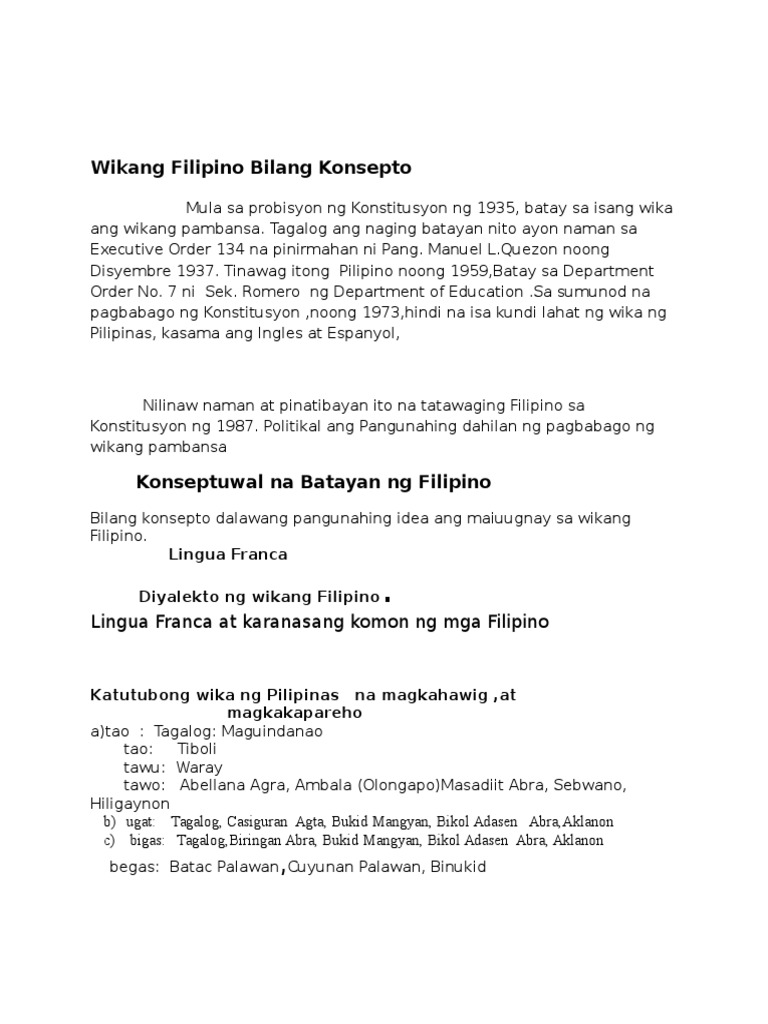 335 serye 1988 nag-aatas sa lahat ng mga kagawaran kawanihan opisina ahensiya at instrumentaliti ng pamahalaan na magsagawa ng mga hakbang na kailangan para sa layuning magamit ang Filipino sa opisyal na mga transaksiyon komunikasyon at korespondensiya. Ekonomiks ng Edukasyon V. Talakayin ang konsepto ng wikang Filipino Ang konsepto ng wikang Filipino ayon kay Ernesto Constantino ay nahahati sa pitong mga sangay na konsepto.
