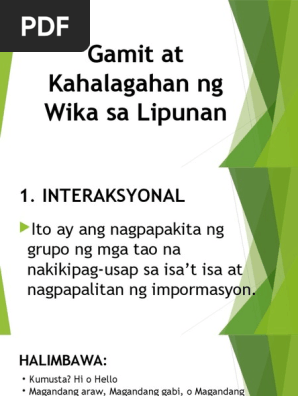 Instrumental regulatori interaksyonal personal imahinatibo impormatib heuristik. Ang wika ay may ibat ibang gamit sa lipunan na nakatutulong sa tao upang makipag-ugnayan sa kapwa. Ang Pilipinas ay may sariling teritoryo kung.