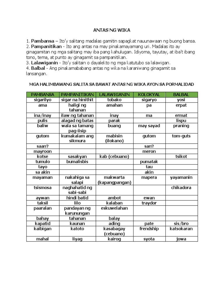 Antas ng Wika Mga Halimbawa ng Matalinghagang Salita ika-apat na Uri 1. Ang pambansa ay kadalasang ginagamit naman sa mga babasahin paaralan pamahalaan at iba pang sentro ng kalakalan o sibilisasyon. Quezon Ama ng Wikang Filipino.