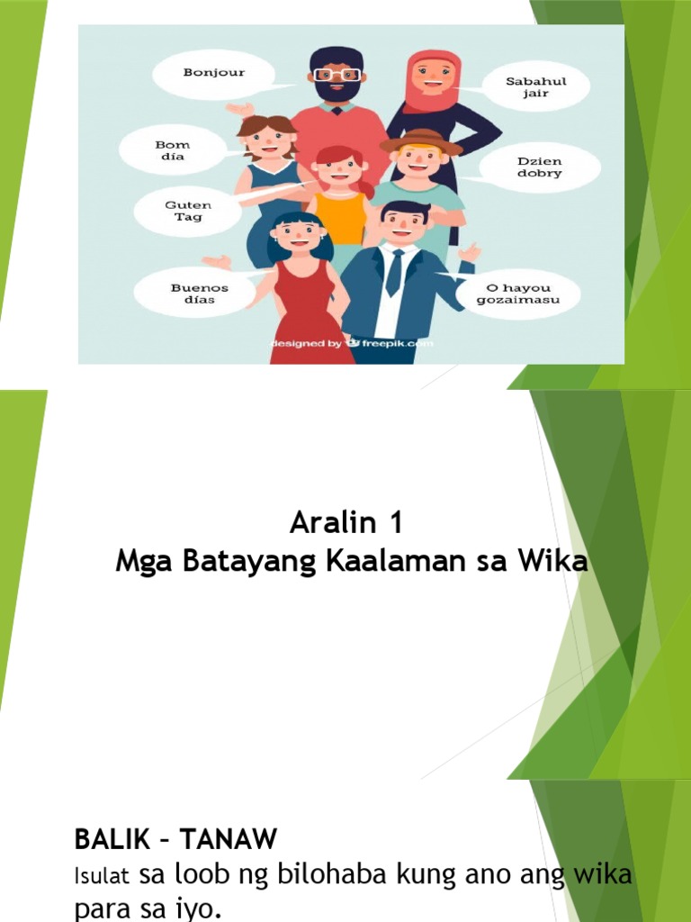 Para sayo ano ang wika. Tinatawag din bilang lengguwahe ang wika ay sinasabing tunog na nililikha ng dila. View Aralin 1pdf from EDUCATION 246B at Southland College Kabankalan City Negros Occidental. View Gawain 1docx from FILIPINO 103 at Surigao del Sur State University Tandag.