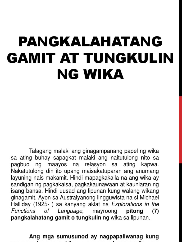 Pitong tungkulin ng wika sa lipunan. Ang tungkulin ng wika na ginagamit sa pagtugon sa mga pangangailangan. The Centric Axis - School Publication of Digos City National High School. Pagiging kritikal sa mga isyu sa lipunan.
