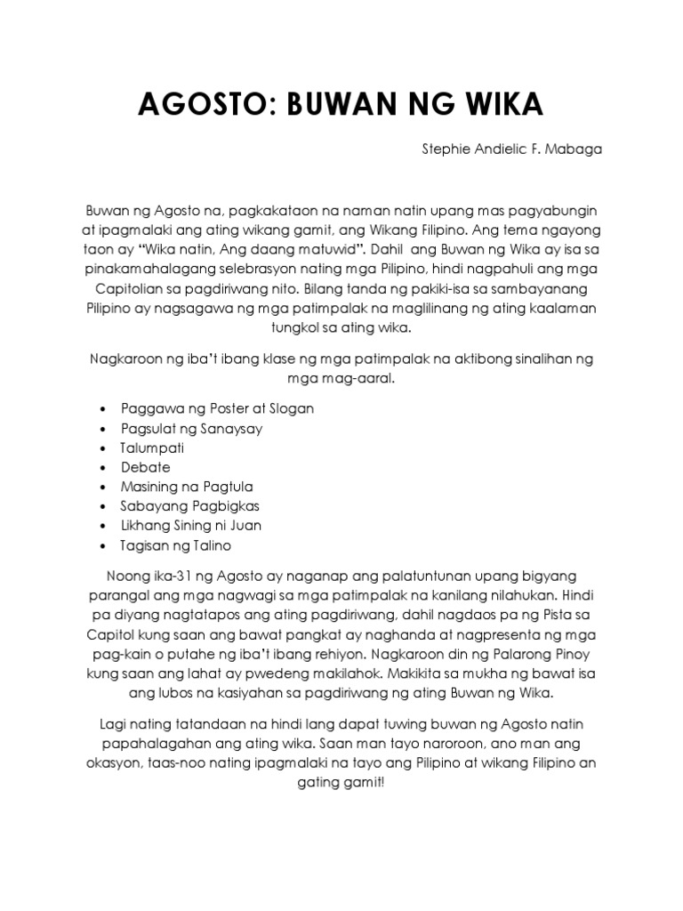 Ang sanaysay na pinamagatang Wikang Pambansa-Filipino ay isang halimbawa ng mga maikling sanaysay tungkol sa kahalagahan at buwan ng wika. SA_AW_K_I_ Ayon sa ating mga ninuno itoy maaari maging gabay sa ating pamumuhay. Tuwing Agosto ay ipinagdiriwang ang Buwan ng Wika sa buong Pilipinas.