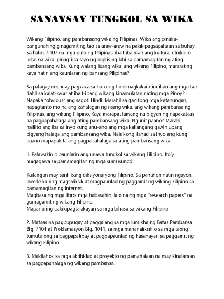 Sanaysay tungkol sa kahalagahan ng wika. Narito ang halimbawa ng sanaysay tungkol sa Wika. 92-1 na naglalahad ng Batayang Deskripsyon ng Filipino. Ito ang mga tanyag na katagang nagmula sa ating pambansang bayani na si Gat.