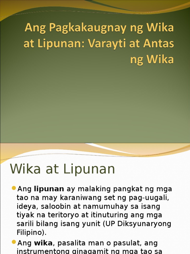 Nakakalungkot mang isipin na maraming tradisyon at gawi ng mga Pilipino ang. Terms in this set 10 WIKA. Ang kalagayan na ito ng wika at lipunan ay tumatalakay sa interrelasyon ng wika at lipunan sa isat isa.