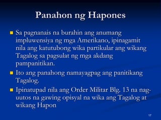 570 na nagtatakdang wikang opisyal na ang pambansang wika. 2017-09-13 b Y X 2 g m 1 p KASAYSAYAN NG WIKA SA PANAHON NG HAPONES F E Noong 1942 hanggang 1945 noong ikalawang dalawang digmaang pandaigdig kung kailan nilusob ng Imperyo ng Hapon ang Pilipinas na dating tinatabanan o nasa ilalim ng kapangyarihan ng Estados Unidos. Magkakaroon ng pambansang pagkakaisa.